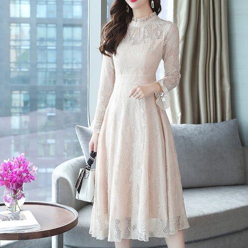 リーフ柄のレースデザインが大人っぽいミドル丈ドレス。
