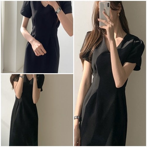 パーティードレス 結婚式 二次会 パーティー フォーマル ミモレ丈 黒 ワンピース チューリップ袖 Vネック シンプル エレガント 半袖 ストレートライン パーティードレス 結婚式 二次会 パーティー
