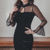 パーティードレス お呼ばれ パーティー ミニドレス 黒 シースルー ドット柄 フリル ベルベット 異素材ミックス タイトシルエット セクシー 長袖 バックシャン 背中見せ パーティードレス お呼ばれ
