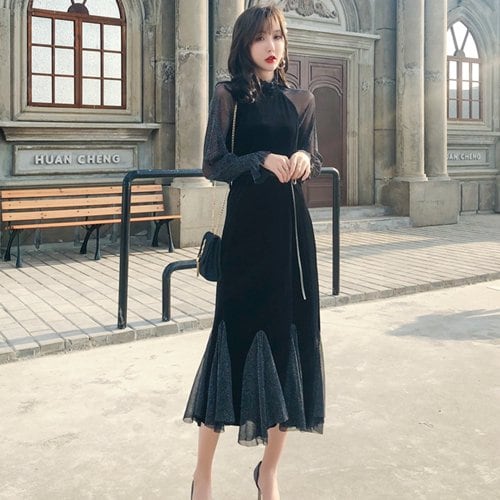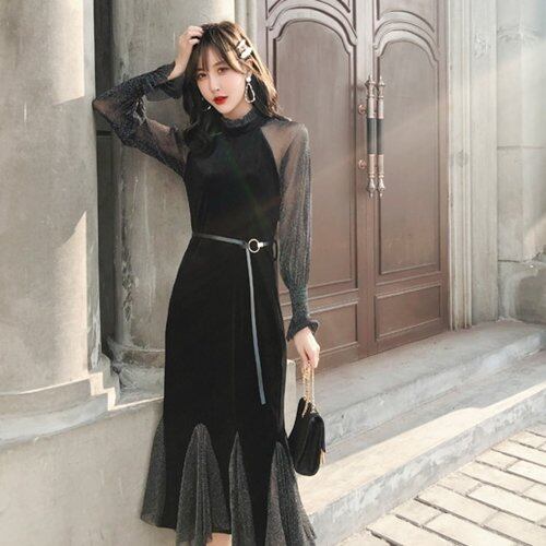 パーティードレス 結婚式 二次会 お呼ばれ パーティー 同窓会 ミモレ丈 黒 異素材 グリッター ラメ ベルベット フリル エレガント シースルー シアー パーティードレス 結婚式 二次会 お呼ばれ