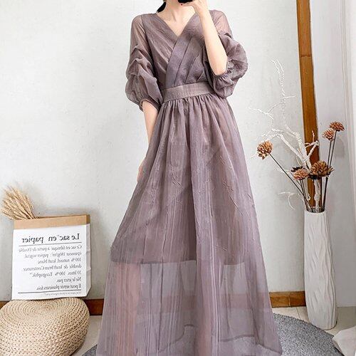 袖のくしゅくしゅっとしたシルエットがかわいいロングドレス。