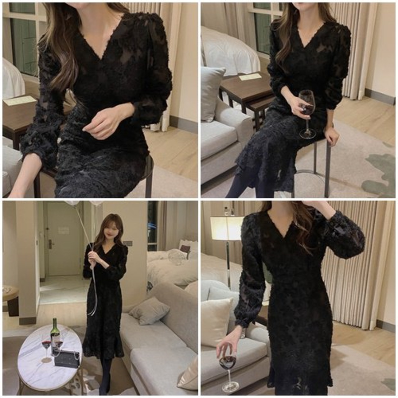 パーティードレス 結婚式 二次会 発表会 同窓会 お呼ばれ パーティー ミモレ丈 ワンピース 黒 白 マーメイド Vネック 長袖 シースルー パーティードレス 結婚式 二次会 発表会 同窓会 お呼ばれ