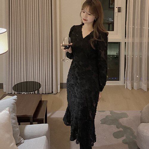 立体的な花柄が華やかで目を惹くミモレ丈ワンピース。