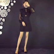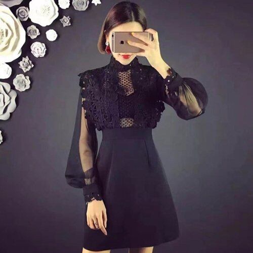 パーティードレス お呼ばれ パーティー シースルー レース ミニワンピース 黒 長袖 シアー バックシャン 大きいサイズ 異素材ミックス ランタンスリーブ パーティードレス お呼ばれ パーティー
