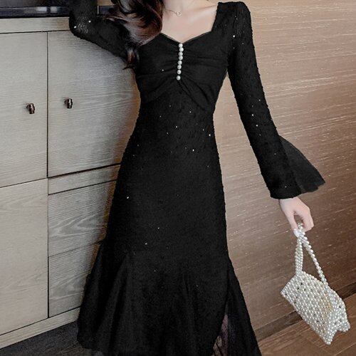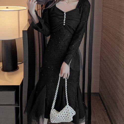 パーティードレス 結婚式 二次会 同窓会 お呼ばれ 発表会 パーティー ミモレ丈ワンピース 黒 マーメイド スクエアネック トランペットスリーブ 長袖 異素材 シフォン エレガント パーティードレス