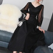 パーティードレス 結婚式 二次会 お呼ばれ 発表会 パーティー ミモレ丈 黒 シースルー ドット柄 Vネック フレアワンピース 大きいサイズ エレガント パーティードレス 結婚式 二次会 お呼ばれ