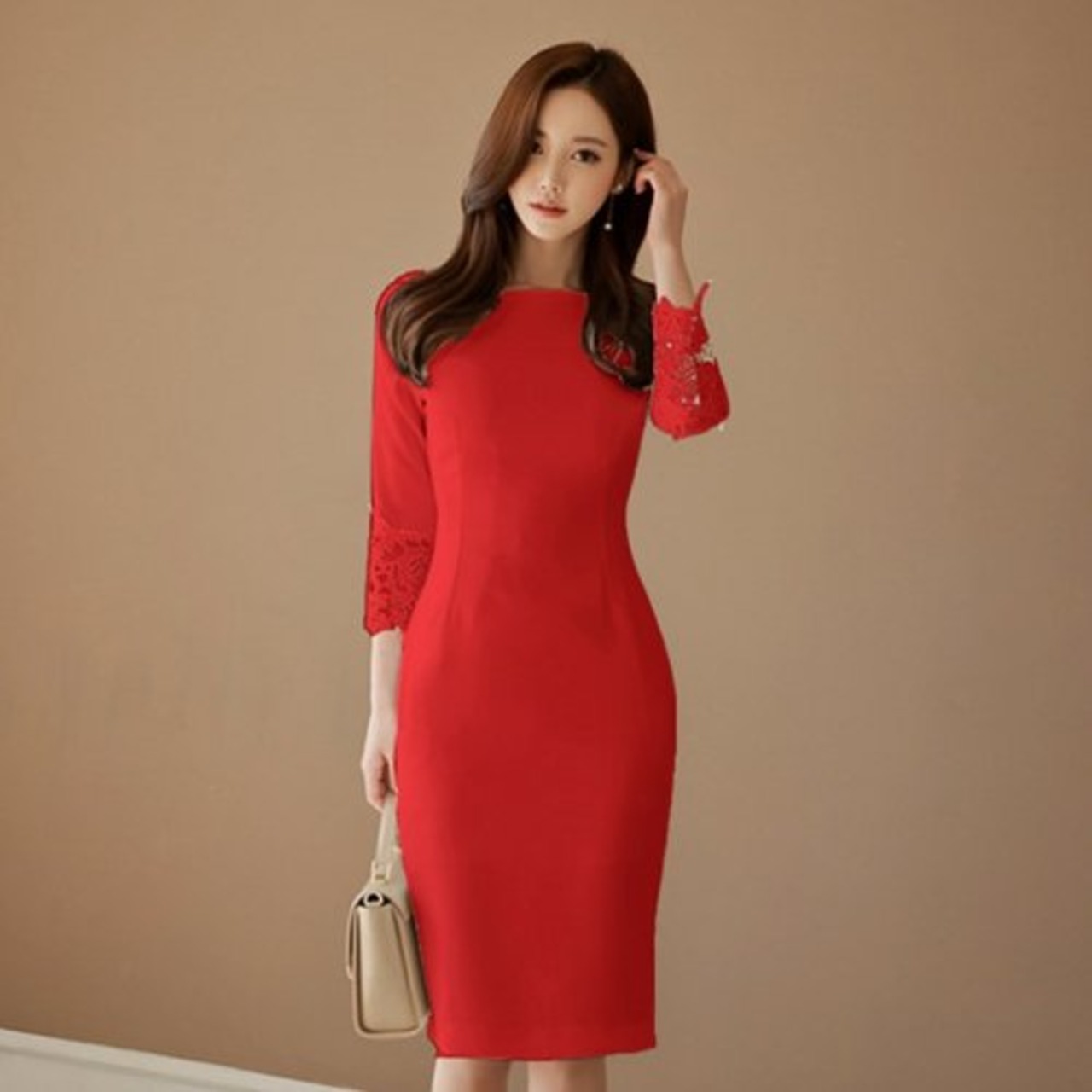 パーティードレス 結婚式 二次会 発表会 同窓会 謝恩会 お呼ばれ パーティー 膝丈 ワンピース 黒 ボートネック レース タイト エレガント 七分袖 大きいサイズ パーティードレス 結婚式 二次会