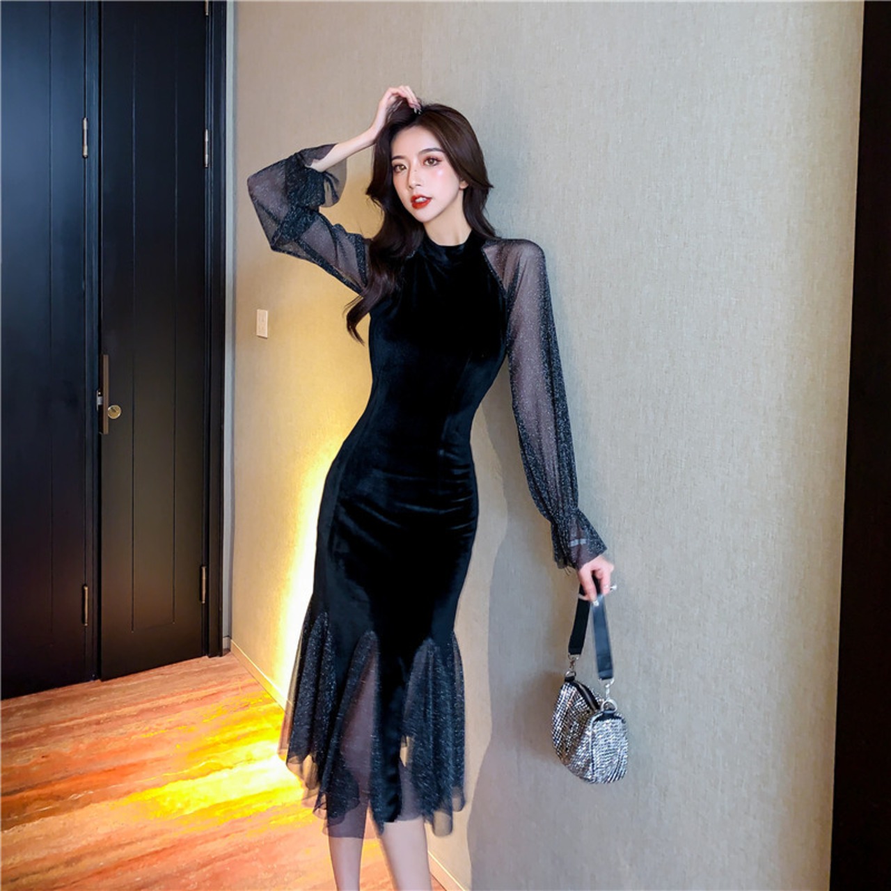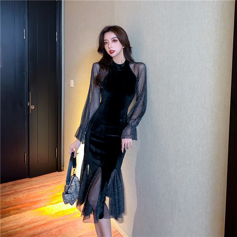 パーティードレス 結婚式 二次会 お呼ばれ パーティー ミモレ丈 黒 マーメイド シースルー グリッター エレガント ランタンスリーブ フェミニン パーティー 結婚式 二次会 お呼ばれ パーティー