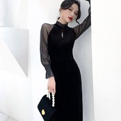 光沢感のあるベルベット素材とシースルーのロングスリーブが