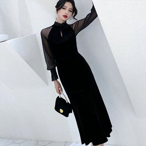 パーティードレス 結婚式 二次会 発表会 お呼ばれ パーティー 異素材 ミモレ丈 ワンピース 黒 ベルベット シースルー 大きいサイズ パーティードレス 結婚式 二次会 発表会 お呼ばれ パーティー