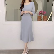 パーティードレス 結婚式 二次会 同窓会 お呼ばれ ミモレ丈 マーメイド スクエアネック 七分袖 エレガント フェミニン パーティードレス 結婚式 二次会 同窓会 お呼ばれ ミモレ丈 マーメイド