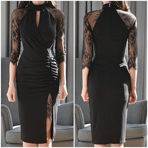 パーティードレス 結婚式 二次会 お呼ばれ パーティー 膝丈 ワンピース キャバドレス 黒 タイト レース スリット セクシー 異素材 パーティードレス 結婚式 二次会 お呼ばれ パーティー 膝丈
