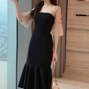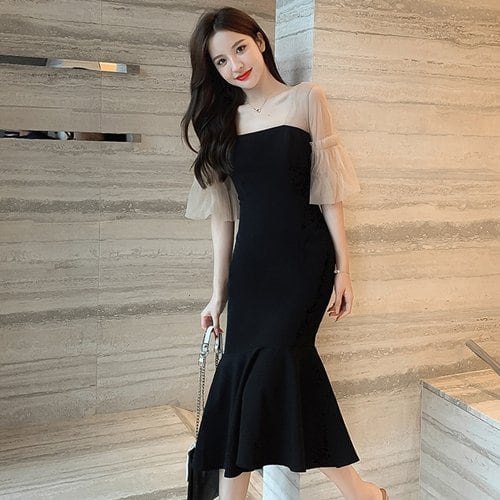 パーティードレス 結婚式 二次会 同窓会 演奏会 お呼ばれ ミモレ丈 フリル マーメイド 異素材 シースルー エレガント パーティードレス 結婚式 二次会 同窓会 演奏会 お呼ばれ ミモレ丈 フリル