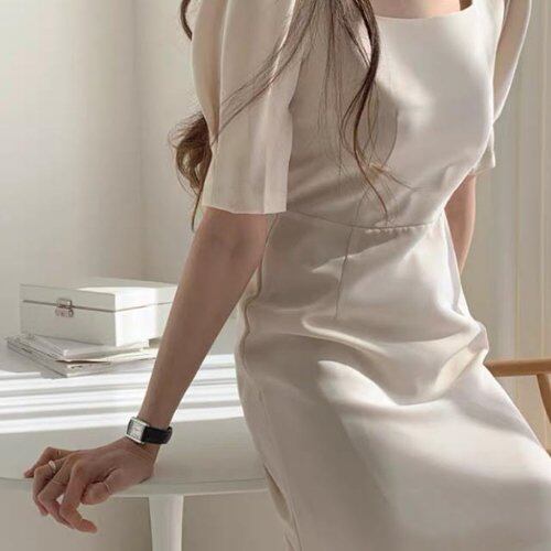 シンプルで女性らしいシルエットのミモレ丈ワンピース。
