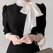 襟元のリボンがアクセントになり大人かわいい印象に。