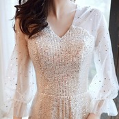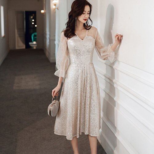パーティードレス 結婚式 二次会 お呼ばれ パーティー ミモレ丈 ワンピース Vネック ボリューム袖 七分袖 シースルー パーティードレス 結婚式 二次会 お呼ばれ パーティー ミモレ丈 ワンピース
