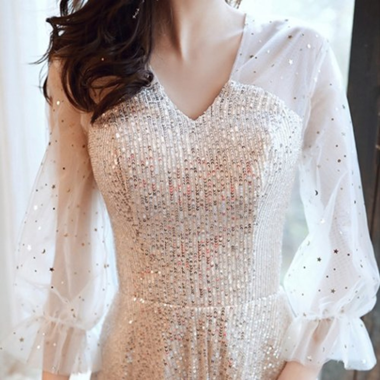 スパンコールが施されたデザインが華やかな印象に。