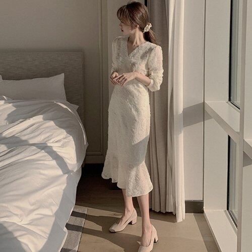 パーティードレス 結婚式 二次会 お呼ばれ パーティー ミモレ丈 ワンピース マーメイド Vネック エレガント パーティードレス 結婚式 二次会 お呼ばれ パーティー ミモレ丈 ワンピース マーメイド