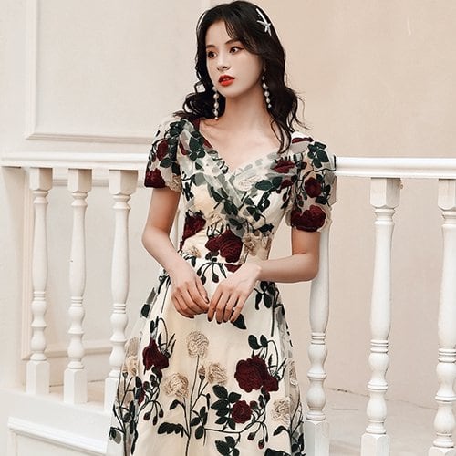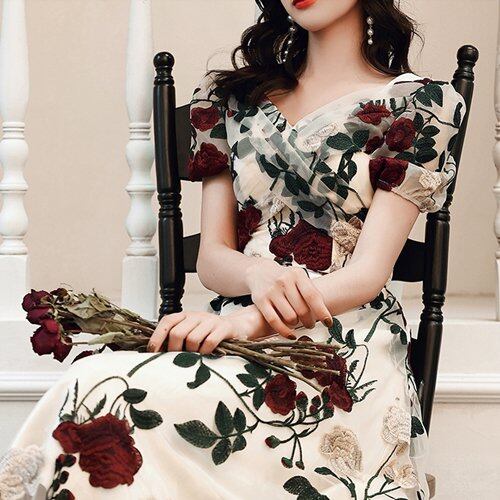 パーティードレス 結婚式 二次会 お呼ばれ パーティー ワンピース 半袖 花柄 Vネック ミモレ丈 シフォン 刺繍 大きいサイズ パーティードレス 結婚式 二次会 お呼ばれ パーティー ワンピース