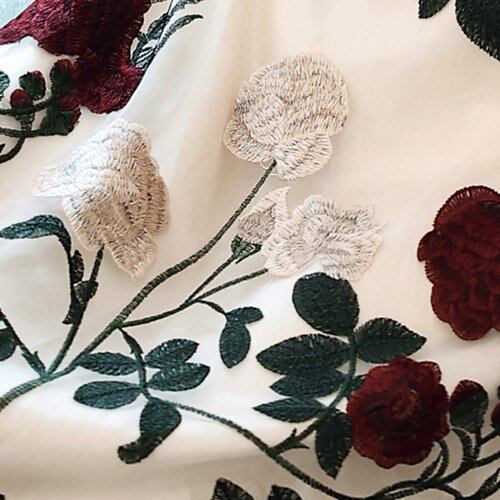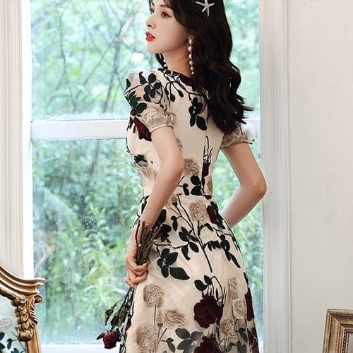 エレガントなローズ柄が女性らしいミモレ丈ワンピース。