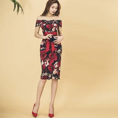 大判の花柄が華やかで目を惹くタイトワンピース。