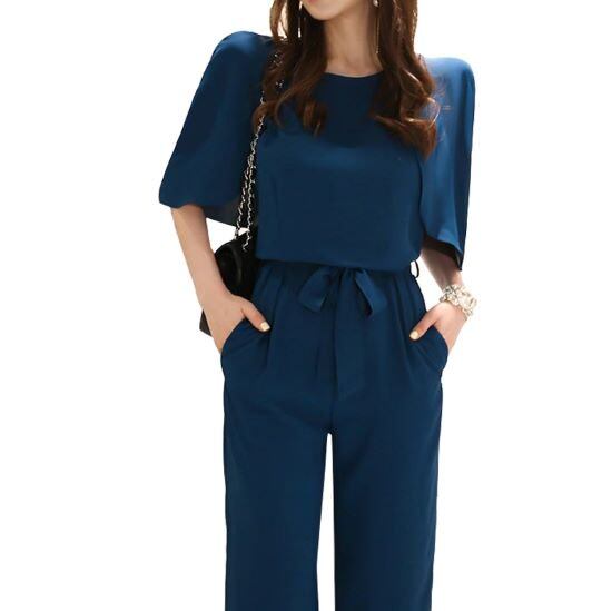 結婚式ドレス パンツスタイル オールインワン ダークブルー 落ち着いた カジュアル 大人っぽい 二次会 謝恩会 結婚式 通勤 スタイルアップ 子連れ 大きいサイズ XL 上品 無地 春夏 単色