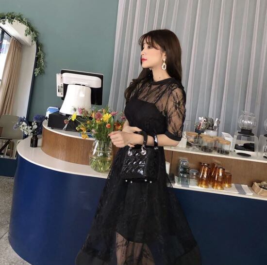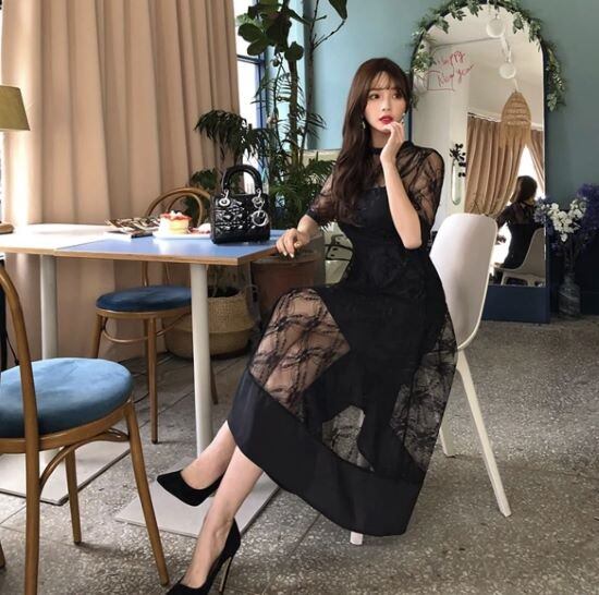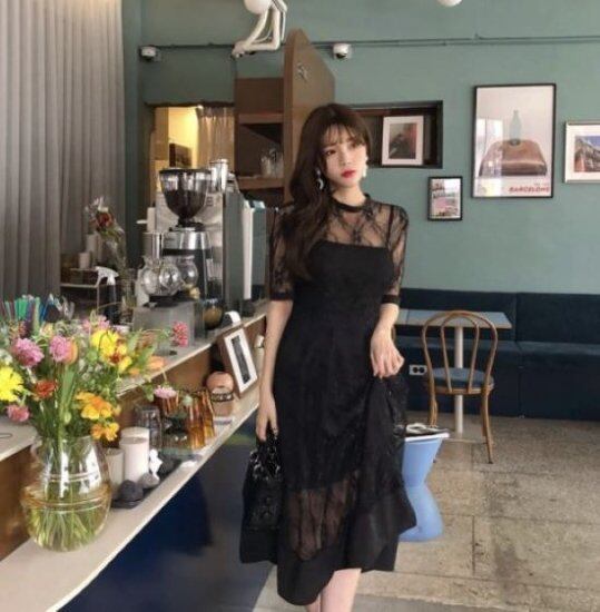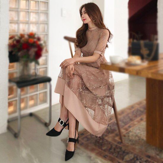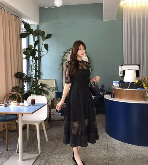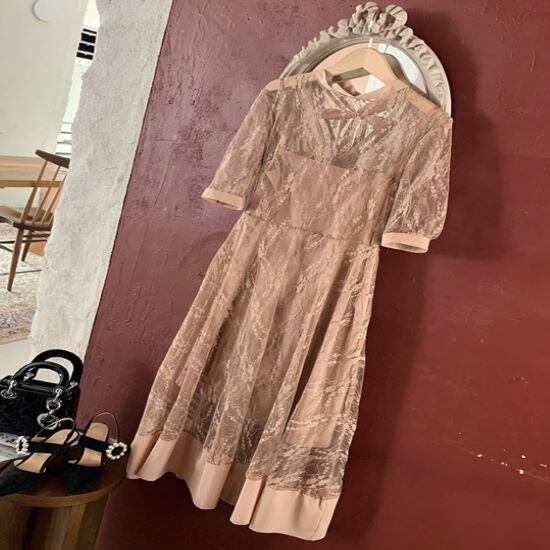 結婚式ドレス パーティードレス ワンピース レース ミモレ丈 結婚式 二次会 謝恩会 半袖 単色 シースルー 女性らしい 可愛い ブラック ピンクベージュ レディース 大人っぽい エレガント ドレス