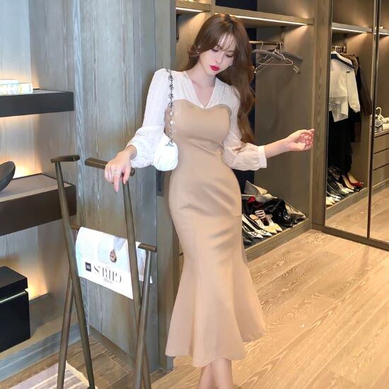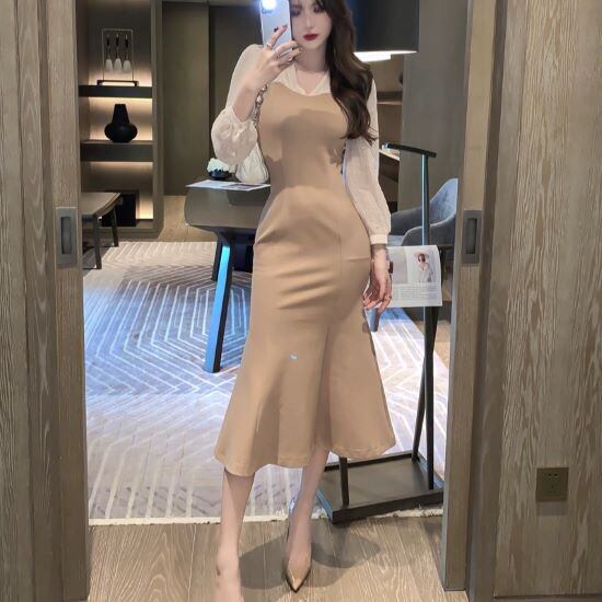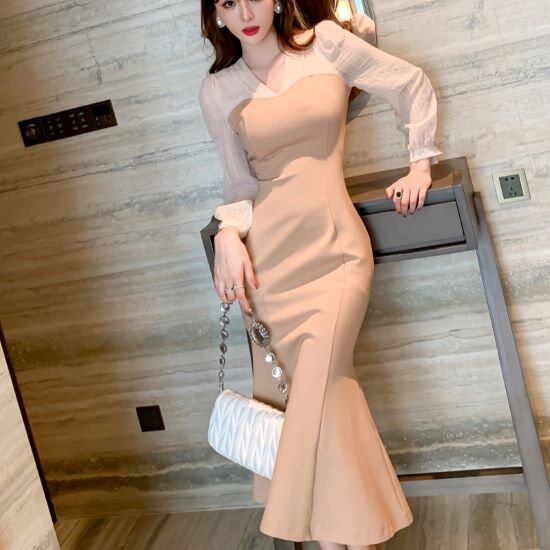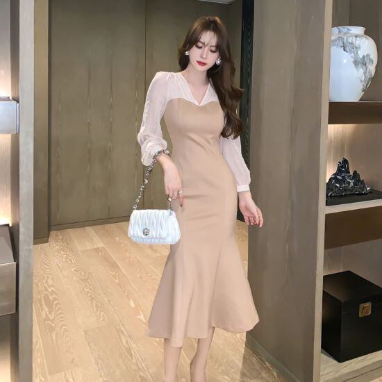 結婚式ドレス マーメイドワンピース タイト ウエスト スタイルアップ ベージュ 長袖 女性らしい レディース ひざ丈 結婚式 二次会 謝恩会 女子会 シフォン シンプル シック 大人っぽい エレガント