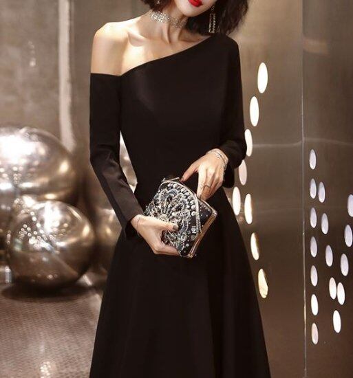 結婚式ドレス ブラック イブニングドレス ワンショルダー フレア 結婚式 二次会 女子会 長袖 無地 ロングスカート 謝恩会 レディース スタイルアップ 大人っぽい ロング丈 2XL 大きいサイズ