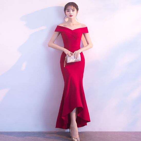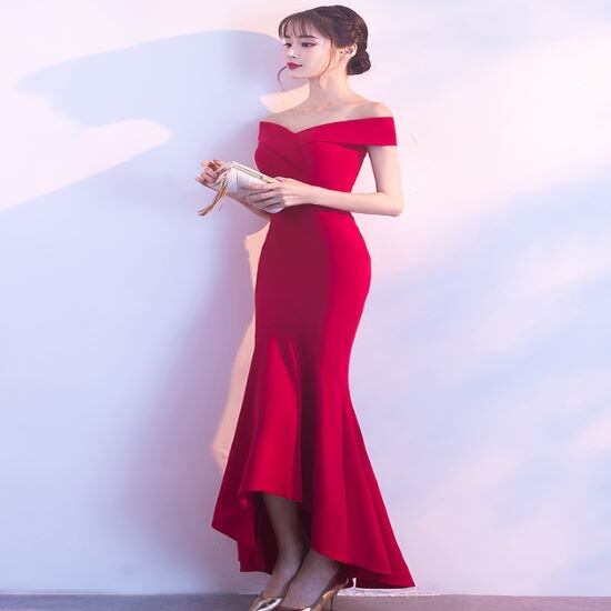 結婚式ドレス マーメイドライン スレンダー ロングスカート 結婚式 二次会 謝恩会 女子会 ブラック レッド マキシ丈 レディース イブニングドレス 大きいサイズ 2XL 無地 オフショルダー