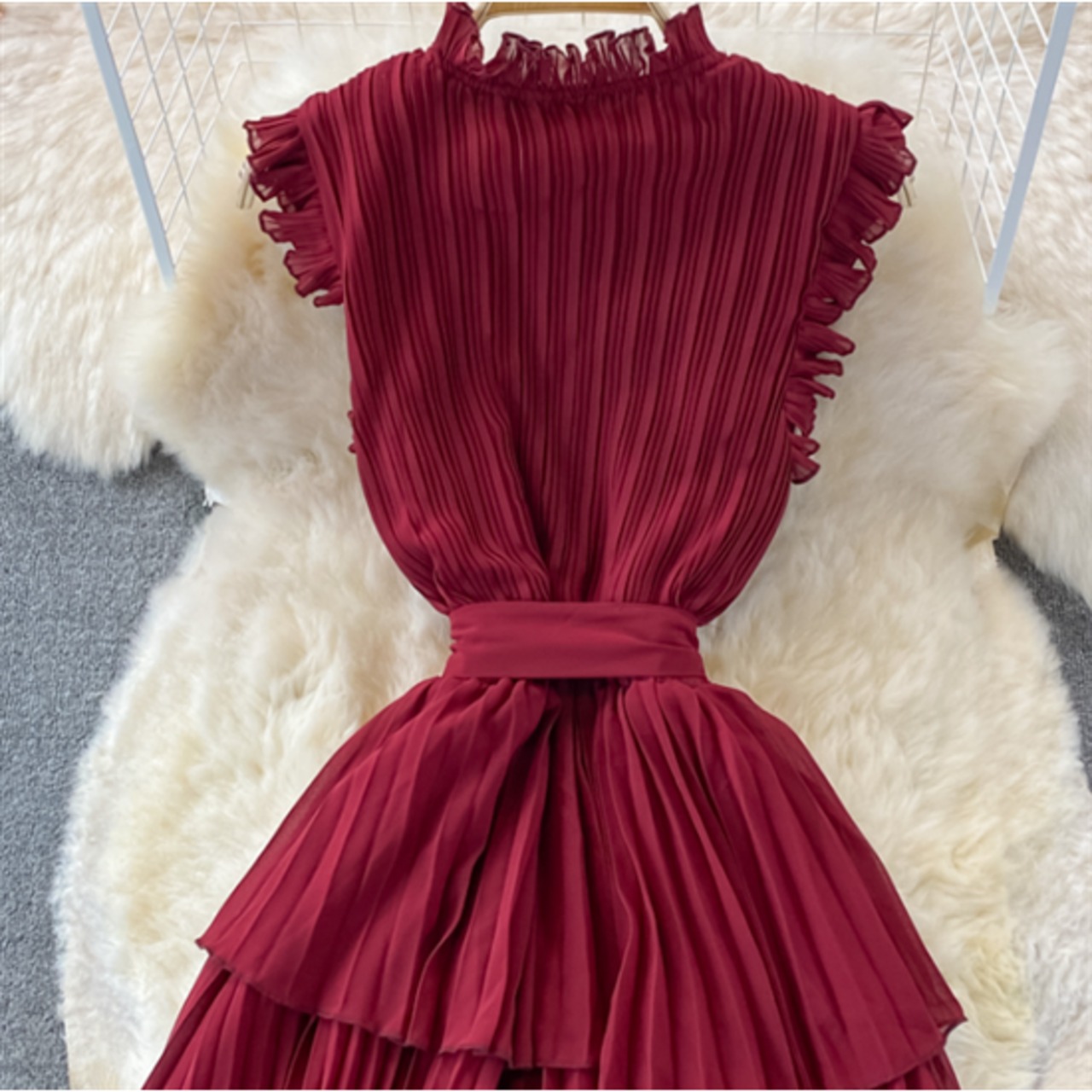 結婚式ドレス ワンピース ハイウエスト プリーツスカート Aラインスカート プルオーバー フライングスリーブ フェミニン お呼ばれ きれいめ フォーマル 半袖 スリム ロングワンピース ドレス