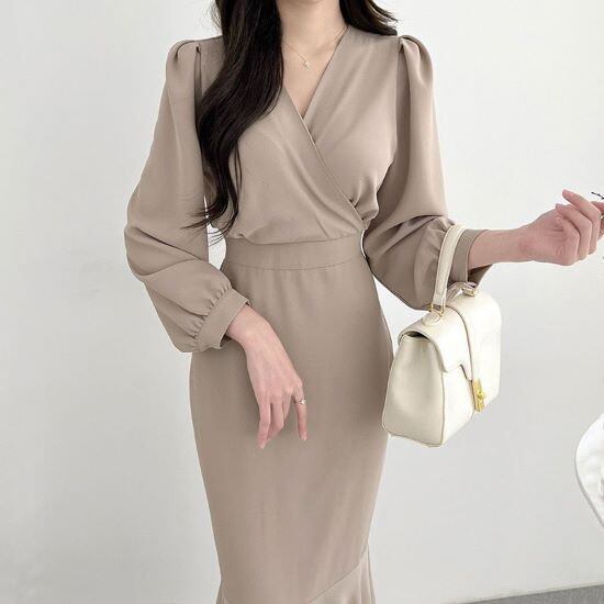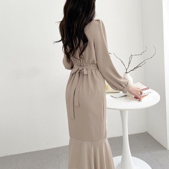 結婚式ドレス パーティードレス タイト マーメイド シフォン ベージュ ブラック Vネック 長袖 結婚式 二次会 謝恩会 女子会 レディース ひざ丈 エレガント フリーサイズ 無地 2色 ロングドレス