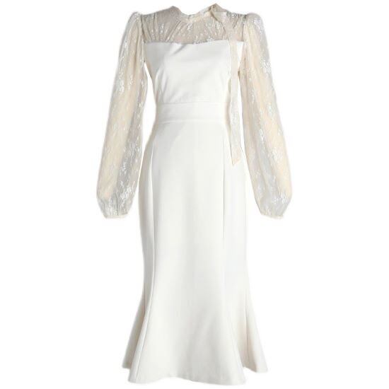 結婚式ドレス パーティードレス レース シフォン 結婚式 二次会 謝恩会 女子会 マーメイドドレス リボン 長袖 S M レディース ホワイト ブラック ピンクベージュ ひざ丈 異素材ミックス