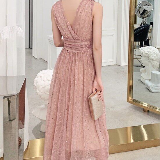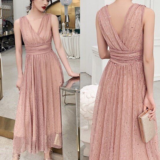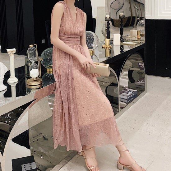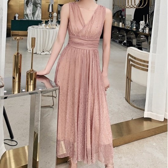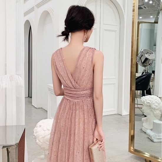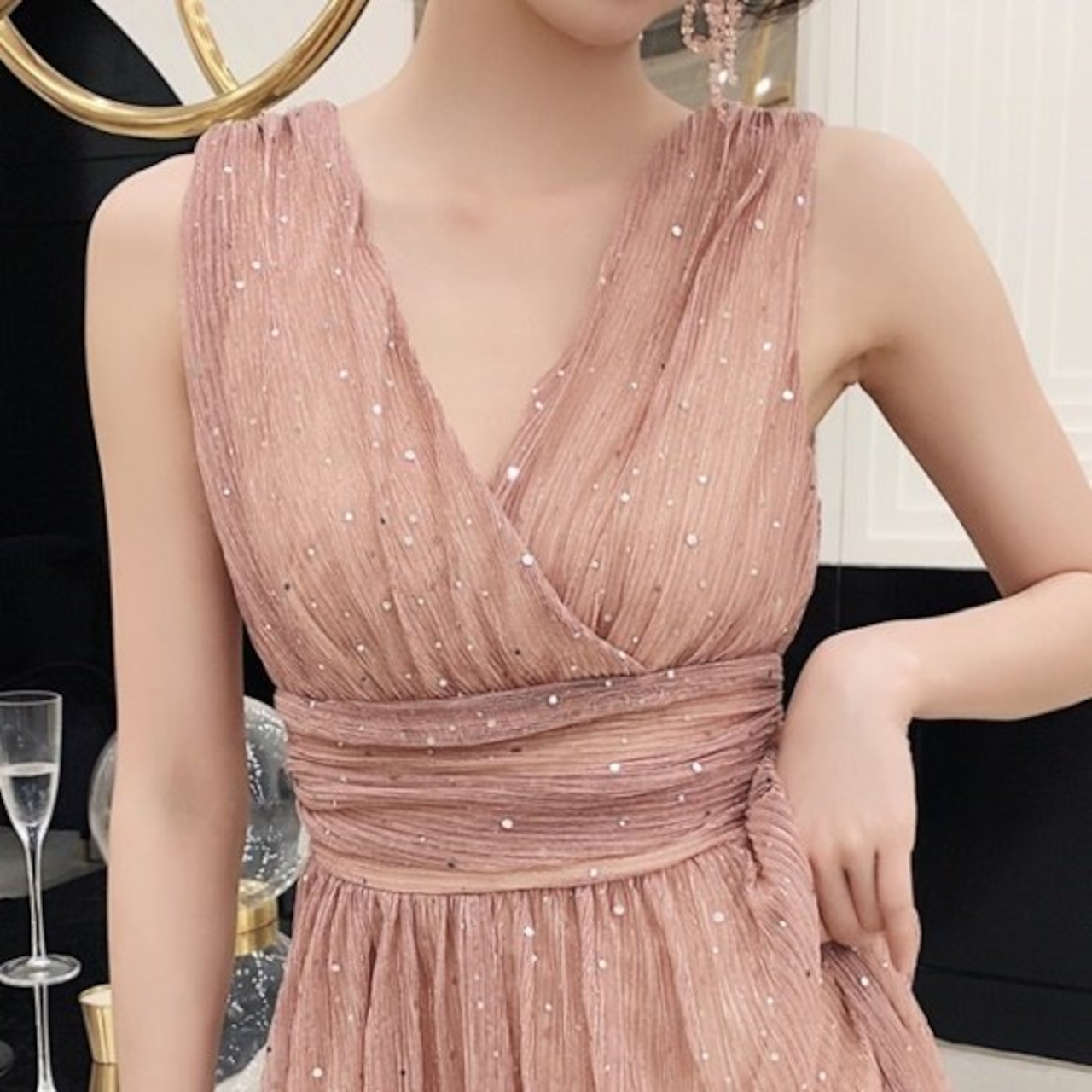ドレス ワンピース Vネック レディース ノースリーブ エンパイアラインVネック ハイウエスト Vネックワンピース お呼ばれ パーティ 結婚式 ニュアンスカラー ビジュー スパンコール ワンピース