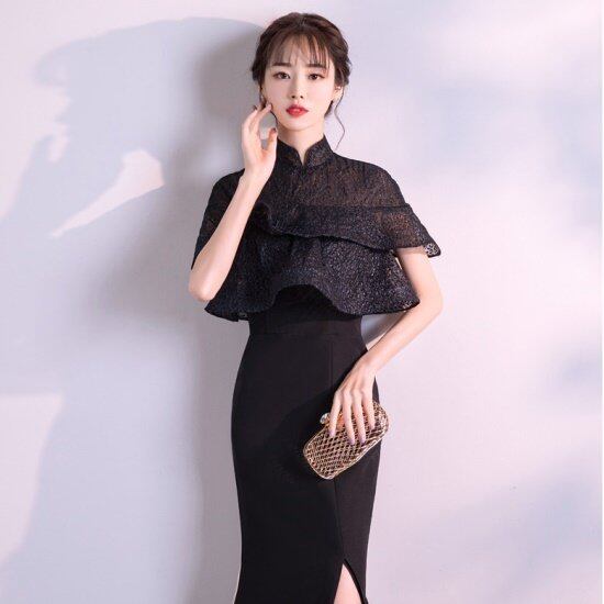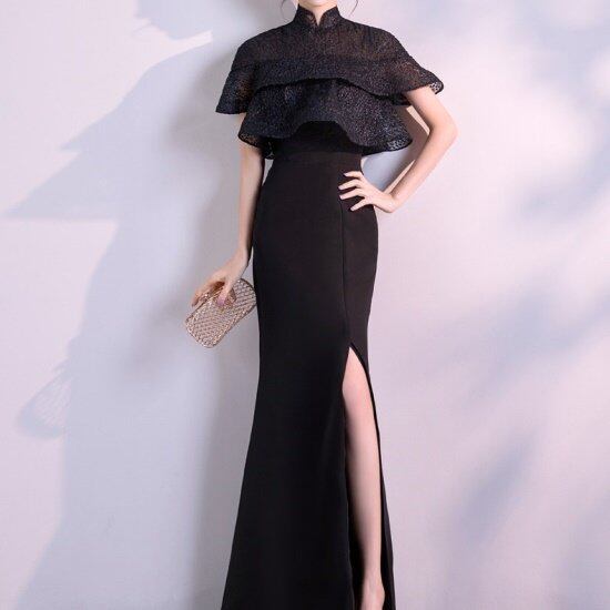 ドレス パーティ お呼ばれ レディース 黒 ワンピース スリット タイト ロングマキシ 半袖 シック 黒ドレス 結婚式 パーティ お呼ばれ フリル タイトワンピース ドレス パーティ 黒 ワンピース