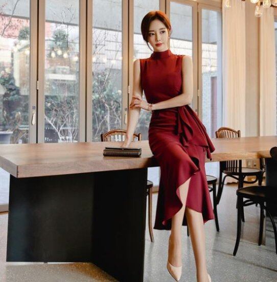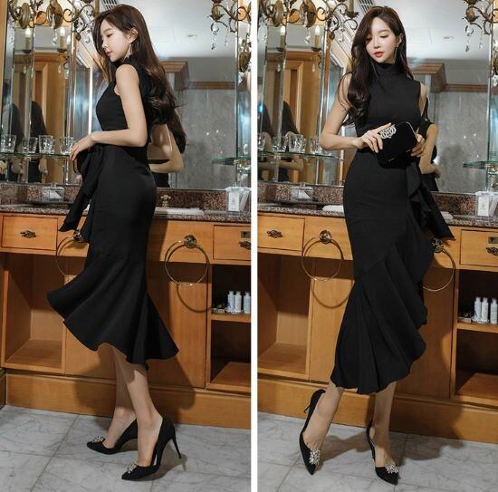 結婚式ドレス パーティードレス マーメイドドレス 結婚式 二次会 謝恩会 女子会 ノースリーブ 無地 大きいサイズ XL バーガンディ ブラック ワンピース ハイネック レディース タイト ひざ丈