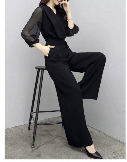Vネックのパンツドレス。