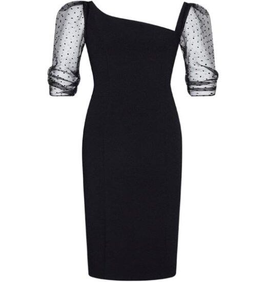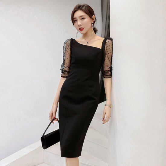 結婚式ドレス パーティードレス ブラック 結婚式 二次会 謝恩会 女子会 ドット アシンメトリー シースルー デザインドレス レディース 七分丈 大人女子 エレガント S M L サマードレス