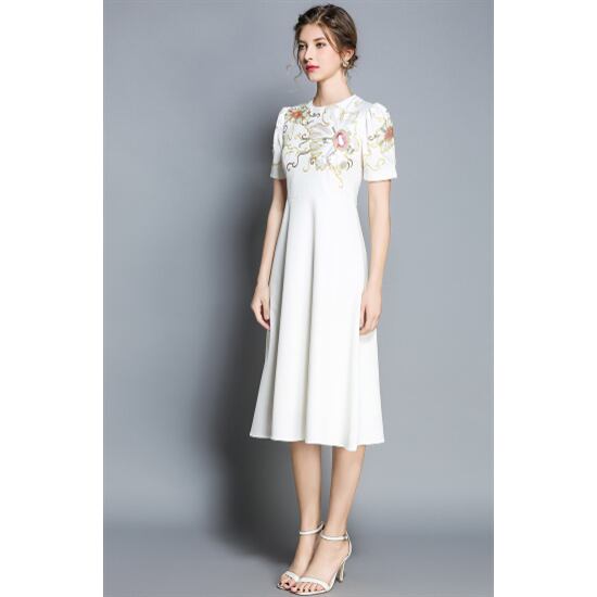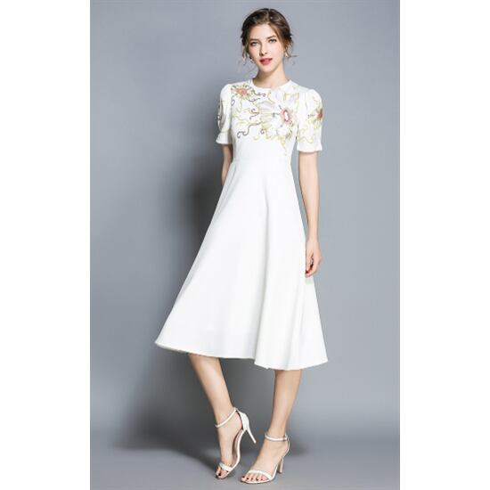 演奏会ドレス ミドル丈ドレス 半袖 大きいサイズ XL 2XL シフォンドレス フォーマル お呼ばれ 刺繍 きれいめ エレガント ホワイト レトロ スリムウエスト 夏服 演奏会ドレス ミドルスカート