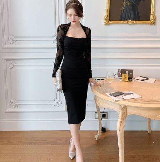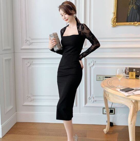 結婚式ドレス パーティードレス ブラック 結婚式 二次会 謝恩会 女子会 エレガント タイトドレス レース 異素材ミックス 長袖 シースルー 単色 大きいサイズ L 花柄レース タイト レディース