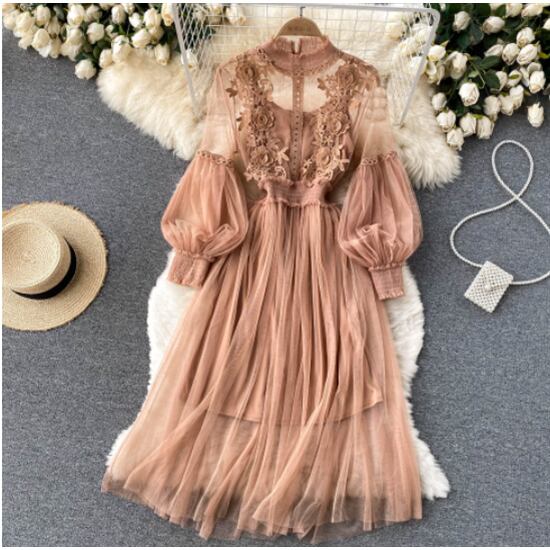 結婚式ドレス フェアリードレス 長袖 Aラインスカート プルオーバー ハイウエスト フェミニン ロングスカート メッシュスカート 結婚式 およばれ フォーマル ボリューム袖 シースルー おしゃれ