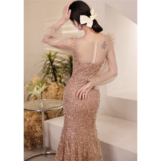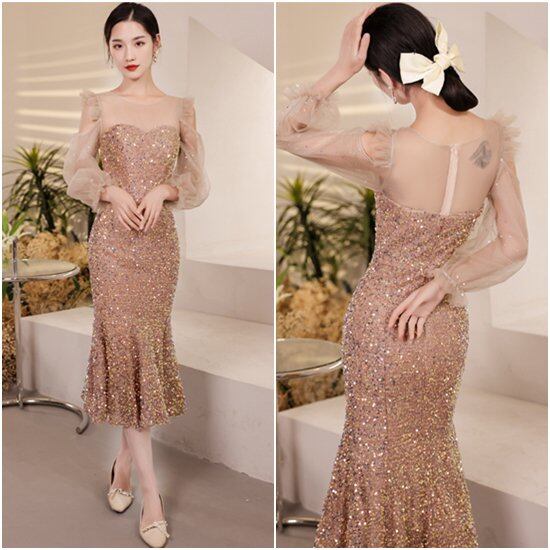 結婚式ドレス イブニングドレス フィッシュテール スリムフィット ミドル丈 スパンコール Uネック 長袖 オフショルダー ゴージャス エレガント およばれ 結婚式 フォーマル 体型カバー 大きいサイズ