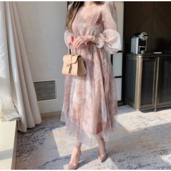結婚式ドレス レディースワンピース 長袖 ミドル丈 ハイウエスト ラウンドネック パフスリーブ Aラインスカート パフ袖 お呼ばれ フォーマル 結婚式 フェミニン おしゃれ ドレススカート シック
