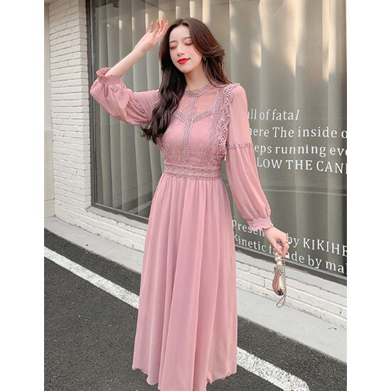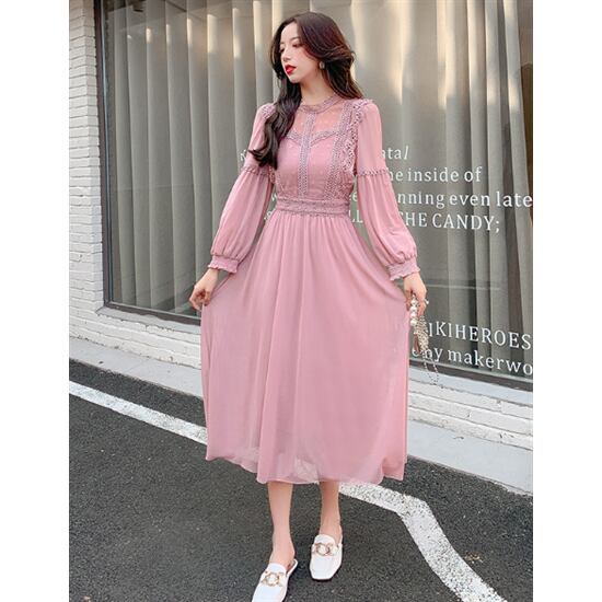 結婚式ドレス ロングワンピース 大きいサイズ XL 無地 長袖 レトロ ハイウエスト ラウンドネック 春服 Aラインスカート シフォンスカート きれいめ 結婚式 二次会 フェミニン エレガント
