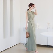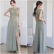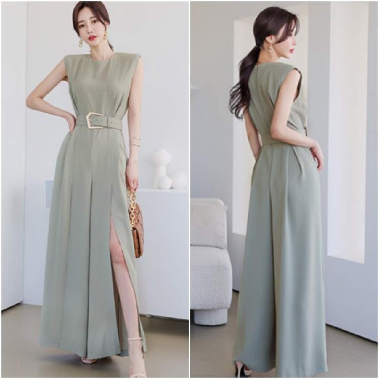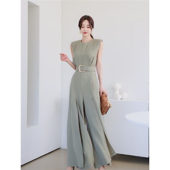結婚式ドレス ジャンプスーツ 大きいサイズ XL スリット ワイドレッグパンツ ノースリーブ ナイロン きれいめ エレガント フォーマル お呼ばれ 結婚式 無地 オールインワン ベルト付き おしゃれ