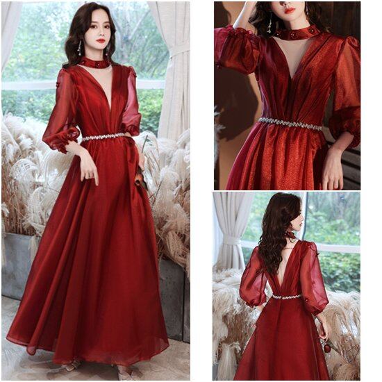 演奏会ドレス ロングドレス 結婚式ドレス イブニングドレス スリムフィット ロングスカート Vネック パフスリーブ 無地 エレガント Aラインスカート フォーマル お呼ばれ 体型カバー 大きいサイズ