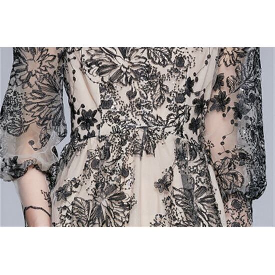 結婚式ドレス 大きいサイズ 2XL Aラインスカート 9袖丈 ワンピースドレス ランタンスリーブ ハイウエスト 総柄 ミドル丈スカート お呼ばれ フォーマル きれいめ メッシュスカート エレガント