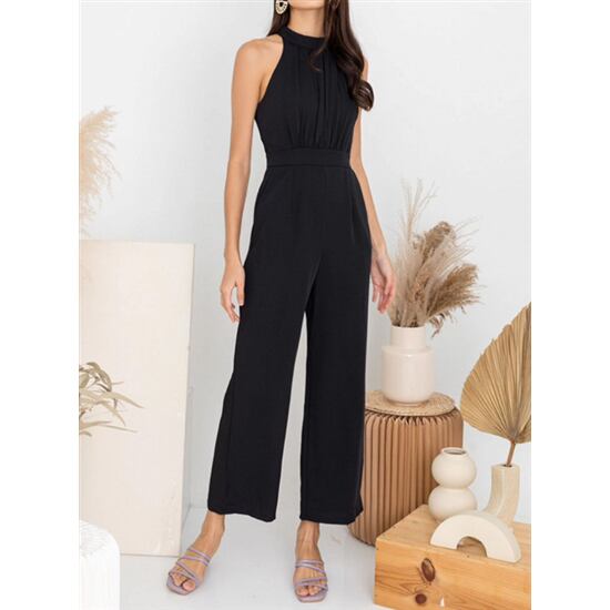 結婚式ドレス ジャンプスーツ パンツドレス ハイウエスト ワイドレッグパンツ 無地 ノースリーブ プリーツ ホルターネック ソロペット きれいめ お呼ばれ フォーマル パーティードレス ゆったり