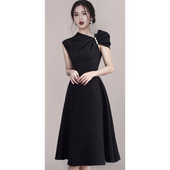 結婚式ドレス 演奏会ドレス 大きいサイズ XL ノースリーブ Vネック ナイロン ハイウエスト ミドル丈 フォーマル お呼ばれ シンプル Aラインスカート エレガント ブラック ワンピースドレス