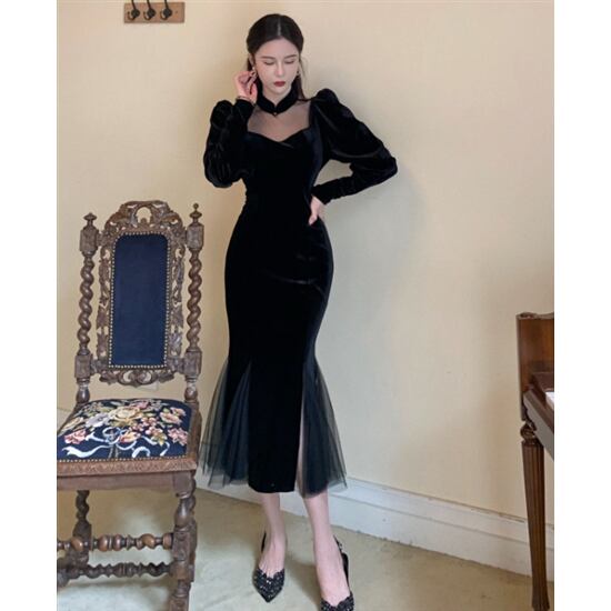 結婚式ドレス 大きいサイズ 長袖 ハイウエスト フィッシュテール スクエアネック パーティードレス お呼ばれ エレガント きれいめ ボリューム袖 ワンピースドレス ミドル丈スカート ブラック レース